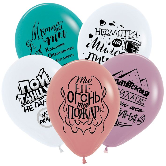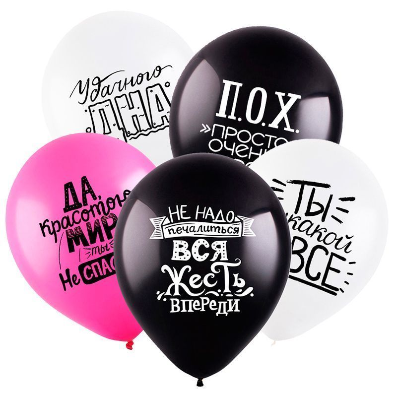В наборе воздушных шаров "Юмор для Нее" 5 дизайнов с двусторонней печатью.
