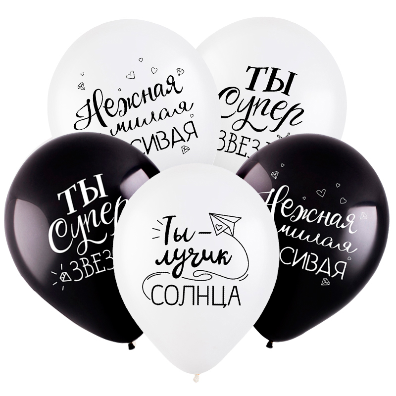 Оригинально поздравить с Днем рождения вам помогут шары из набора «Комплименты для нее». Набор воздушных шаров "Комплименты для нее" состоит из 3 текстовых дизайнов с 2х сторонней печатью. В палитре набора содержатся шары черного и белого цвета.